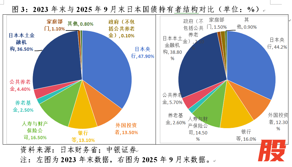 根据日本财务省披露的数据,截至2025年9月末,外国投资者持有日本T-BILLS余额76.5万亿日元,约占日本T-BILLS存量规模的54.4%;持有日本JGB余额69万亿日元,约占日本JGB存量规模的6.6%。从全口径日债看,外资持债占比与日本央行退出YCC高度同步,从2024年3月末的13.0%一路降至2024年末的11.3%。2025年以来其持债规模虽有所回升,但集中在T-BILLS(新增1.2万亿日元),JGB持债规模较平稳(新增0.1万亿日元)。2023年末至2025年9月末,日本央行、外国投资者、人寿保险公司持有日债占比分别回落3.7、1.2和2.0个百分点,银行、养老基金及公共养老金、政府(不包括公共养老金)分别上升2.9、1.4和2.0个百分点(见图3)。需求不足导致市场缺乏流动性,小额抛售便足以引发大震动。根据日本债券交易公司数据,1月20日超长期国债交易金额仅有2.8亿美元。