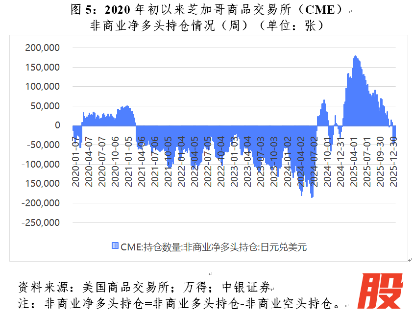 日美利差与日元汇率关系的“逆转”是日本经济深层次结构问题、财政刺激预期,以及市场提前消化加息预期等多因素共振的结果。如果日本央行加息幅度与节奏不到位,则难以扭转日元颓势。而日元持续贬值反过来又将推升加息压力:其一,贬值推高进口成本,加大日本输入性通胀压力,日本央行为稳通胀不得不加息;其二,尽管日美利差收窄,但利差绝对水平仍可覆盖套息交易成本,叠加日本政府债务负担加重削弱日元资产吸引力,资金持续外流,日本央行为稳汇率不得不加息。美国商品期货交易委员会数据显示,日元对美元非商业净多头持仓规模自2025年5月以来持续回落,到2026年1月底重新跌回净空头区间,反映了投机资金再次转向看空日元(见图5)。