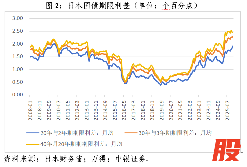 “高市冲击”的直接原因是本次公布的减税计划动摇了市场对日本财政可持续性及财政纪律的信心。与短端国债收益率着重反映货币政策松紧预期不同,长期国债收益率侧重对通胀预期和财政风险的定价。新冠疫情以来,日本大规模财政刺激的出台推动国债期限利差(以长期限国债收益率扣减2年期国债收益率计算)步入上行通道,2025年以来期限利差变得更加陡峭。到2026年1月,月均20年、30年和40年期与2年期日债收益率差分别较2024年12月上升了0.64、0.66和0.48个百分点(见图2)。此次高市早苗宣布的消费税减免被限定为两年,但市场预估每年仍将造成约5万亿日元税收损失。高市政府对于如何弥补相应财政收支缺口语焉不详,本次减税究竟是“暂时”还是“永久”,亦存在不确定性。