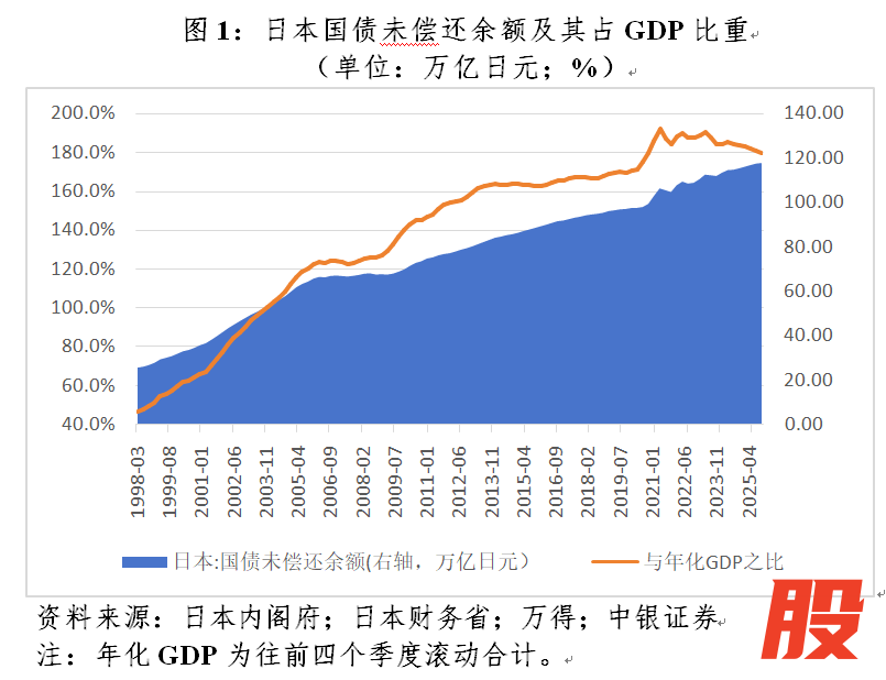 日本政府债台高企与日本经济“失去的三十年”密切相关。上世纪九十年代资产泡沫破裂,将日本推入资产负债表衰退。在非金融企业和家庭部门大幅去杠杆的背景下,日本政府不得不通过财政扩张来应对经济下行。在持续的财政刺激下,日本国债余额与年化国内生产总值(GDP)之比节节攀升,高至190.5%,到2025年9月末仍有179.5%(见图1)。国际货币基金组织(IMF)数据显示,2024年底日本政府债务与GDP之比为237%,系全球发达经济体中最高。
