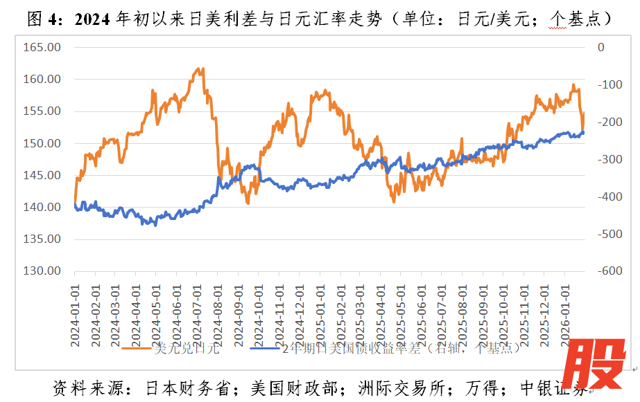 当日本深陷保汇市还是保债市的两难之际,2026年1月23日一则关于纽约联储询价日元汇率的报道引发了日美联合干预日元贬值的市场猜想,当天日元升值1.74%,创下5个月来单日最大涨幅。1996年以来,美国仅三次干预过汇市,上次是2011年日本地震后。2026年1月26日,日本财务省表示,日本当局将视需要与美国方面密切协调,对汇市波动做出适当回应。到1月30日,日元汇率收在154.77,较1月23日进一步升值了1.74%(见图4)。